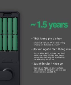 Khóa cửa thông minh Aqara A100 sử dụng 8 Pin AA (có đi kèm) với tuổi thọ lên đến 1,5 năm* và bạn hoàn toàn có thể sạc điện khẩn cấp với cáp Type – C nếu chẳng may khóa hết Pin mà chưa kịp thay.
