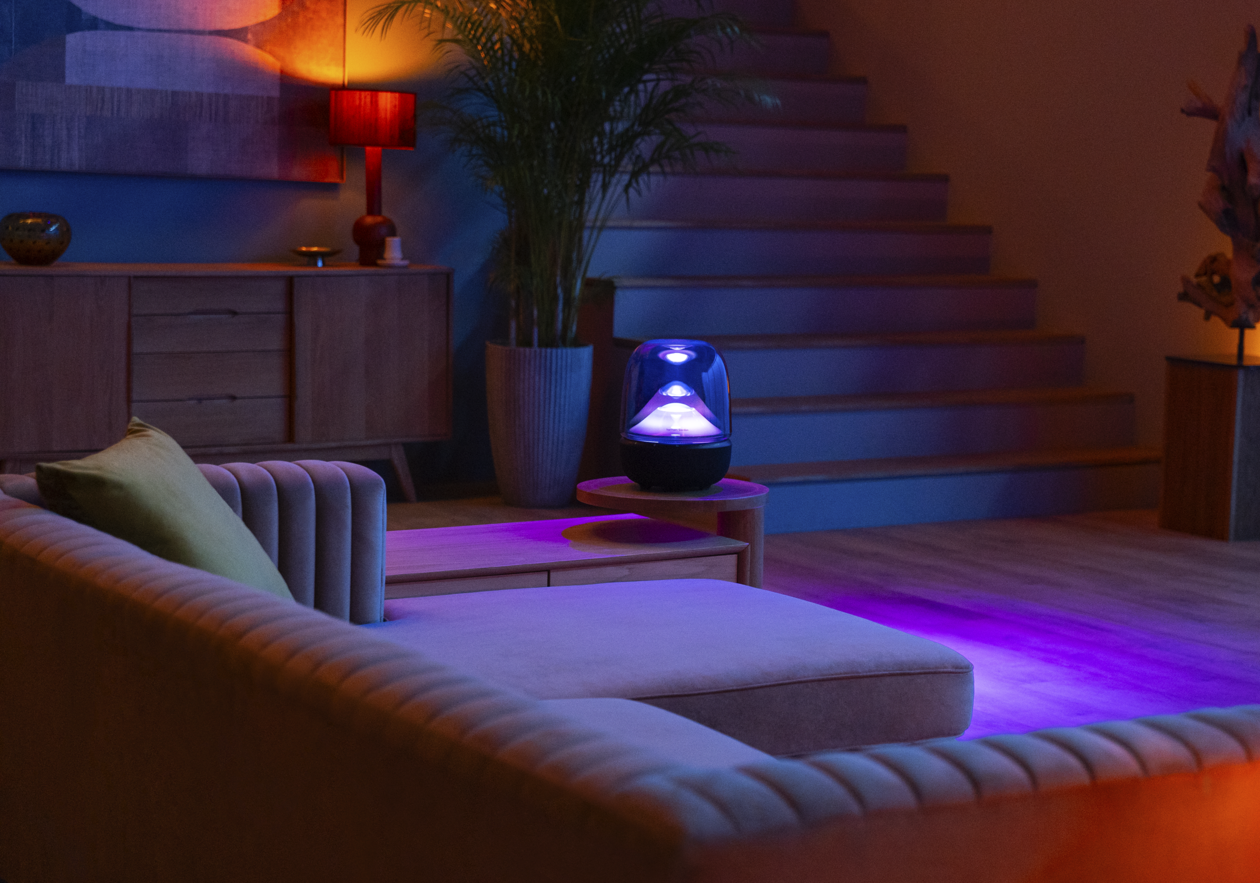 Đưa bạn vào sự tổng hoà của cả ánh sáng lẫn âm thanh, đồng hành tới từng nốt nhạc cảm xúc. Hiệu ứng trình diễn ánh sáng môi trường 360 độ đầy biểu tượng nay còn lan toả mạnh mẽ hơn bao giờ hết với thấu kính chiếu sáng mới phản chiếu những hoạ tiết động từ đỉnh loa lên trần nhà, bao trùm bạn với bầu không khí chìm đắm đầy mê hoặc. Sử dụng ứng dụng Harman Kardon One để cá nhân hoá màu sắc, hoạ tiết sánh sáng phù hợp với mạch cảm xúc, cho mỗi khoảnh khắc trở nên đáng nhớ.