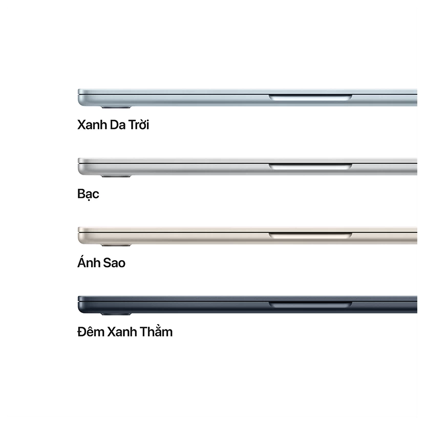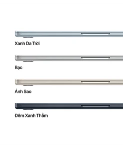 MacBook Air M4 có sẵn bốn màu sắc sang trọng gồm Xanh da trời, Bạc, Ánh sao và Đêm xanh thẳm. Những tùy chọn màu sắc này không chỉ giúp người dùng thể hiện phong cách cá nhân mà còn mang đến cảm giác cao cấp và hiện đại. Mỗi màu sắc đều được xử lý bằng lớp phủ chống bám vân tay, giúp máy luôn giữ được vẻ ngoài sạch sẽ và tinh tế.