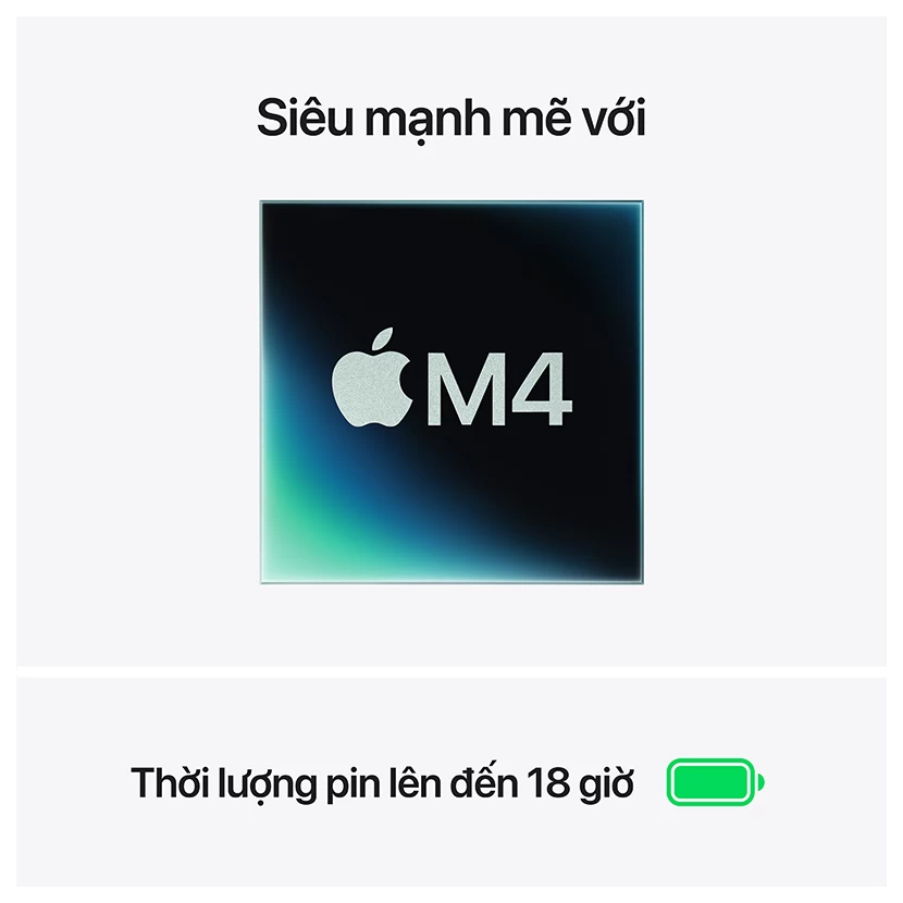 Với sức mạnh từ chip Apple M4, thiết bị không chỉ mang lại hiệu năng vượt trội mà còn đảm bảo tính ổn định và tiết kiệm năng lượng. Đây là lựa chọn hoàn hảo cho cả người dùng phổ thông lẫn các chuyên gia cần một thiết bị mạnh mẽ để phục vụ công việc sáng tạo và xử lý tác vụ nặng.