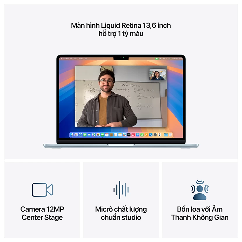 Về camera, MacBook Air M4 được trang bị camera 12MP Center Stage với khả năng tự động điều chỉnh khung hình và hỗ trợ chế độ Desk View, giúp nâng cao trải nghiệm gọi video. Máy cũng có thể quay video HD 1080p và sử dụng bộ xử lý tín hiệu hình ảnh tiên tiến với video điện toán để cải thiện chất lượng hình ảnh.