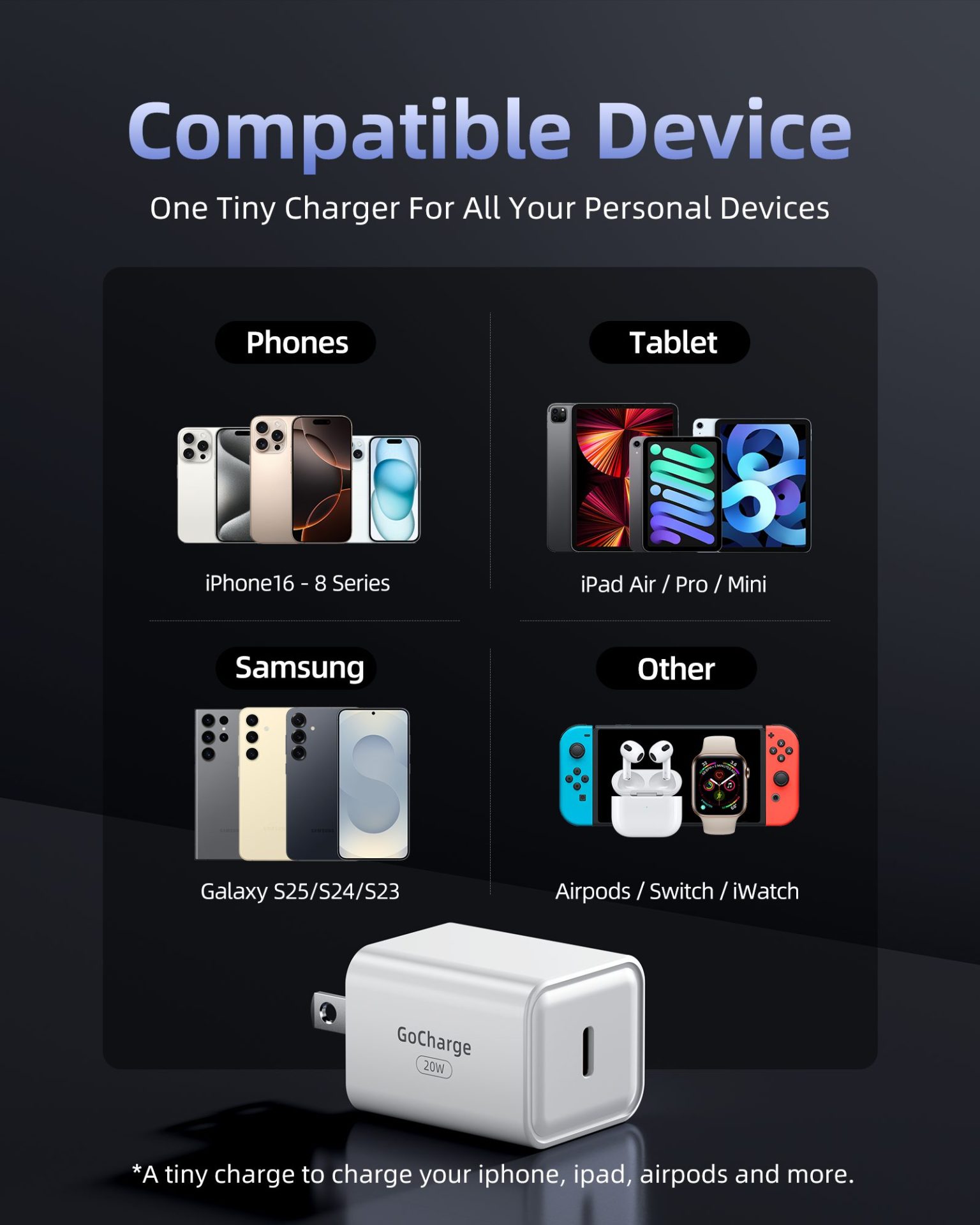 Quên đi việc phải mang theo nhiều bộ sạc khác nhau! GoCharge 20W là “một bộ sạc nhỏ gọn cho tất cả các thiết bị cá nhân của bạn”. Sản phẩm tương thích rộng rãi với: